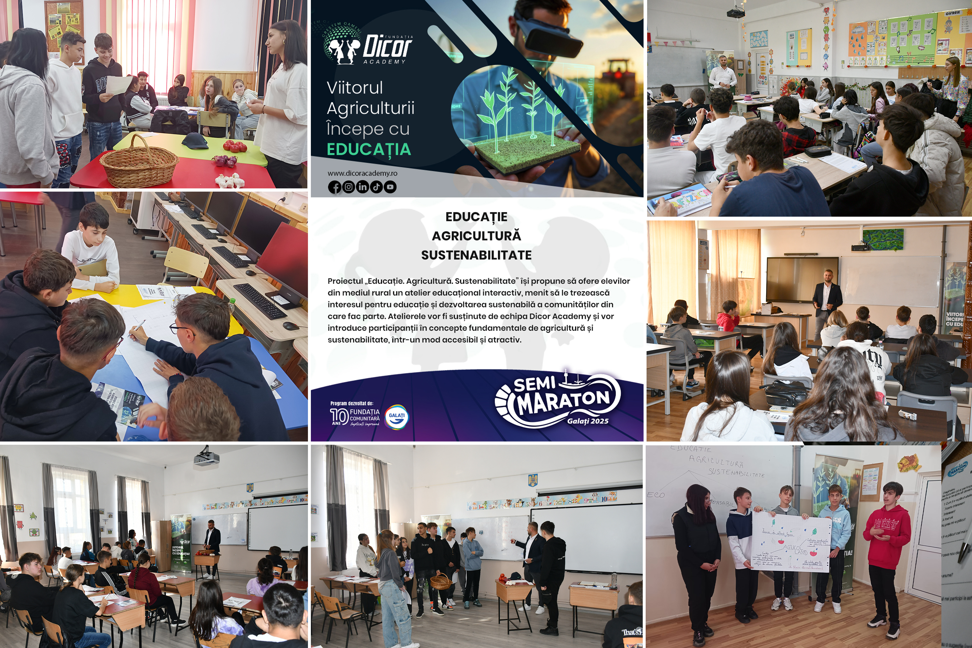 În cadrul Semimaratonului Galați 2025, Fundația Dicor Academy a participat cu proiectul „Educație. Agricultură. Sustenabilitate”, o inițiativă dedicată elevilor din mediul rural, care urmărește să aducă în prim-plan importanța educației, agriculturii și implicării sustenabile în comunitate.Prin acest proiect, ne-am propus să le oferim copiilor un atelier educațional interactiv, construit pe nevoile și curiozitățile lor. Scopul este să le deschidem orizonturile către un domeniu esențial – agricultura – și să îi încurajăm să devină parte activă din dezvoltarea comunităților din care provin.Atelierele sunt susținute de echipa Dicor Academy și includ următoarele etape:1. Introducere și prezentare generală Elevii descoperă importanța agriculturii și cum aceasta susține economia și viața rurală.2. Elementele unei ferme agricole Cu ajutorul materialelor vizuale, copiii explorează structura unei ferme și află ce meserii sunt necesare pentru funcționarea acesteia.3. Trivia interactivă – Agricultură & SustenabilitateUn joc antrenant cu întrebări și răspunsuri multiple care le testează cunoștințele și le stimulează curiozitatea.Un joc antrenant cu întrebări și răspunsuri multiple care le testează cunoștințele și le stimulează curiozitatea.4. Concurs de dezbateri Elevii sunt provocați să vină cu idei prin care pot contribui la dezvoltarea sustenabilă a comunității – fie prin soluții ecologice, sociale sau economice.5. Concluzii și feedback Fiecare participant primește o diplomă simbolică și are ocazia să își exprime părerea despre activitate.Suntem bucuroși că prin acest proiect putem pune o piatră de temelie în educația practică a tinerilor și că putem planta semințele unei gândiri sustenabile încă de la vârste fragede.Mulțumim Fundația Comunitară Galați pentru oportunitatea de a transforma ideile în realitate și comunitățile în spații vii de învățare!Proiect finanțat prin Semimaraton Galați 2025, program Fundația Comunitară Galați